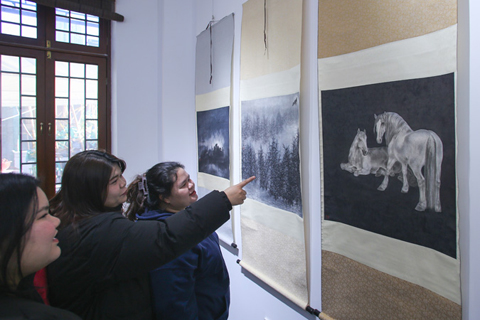 ◎ 十二月二十九日,宮春虎水墨畫馬藝術中心「喜迎馬年,五代畫馬人馬畫藝術展」在天津古文化街海雅茶園啟幕。展覽展示了中國現代水墨畫馬先驅徐悲鴻先生及其弟子韋江凡、再傳弟子宮春虎以及兩代學生的馬畫作品。圖為在津外籍留學生參觀展覽。(中新社記者 佟郁 攝)