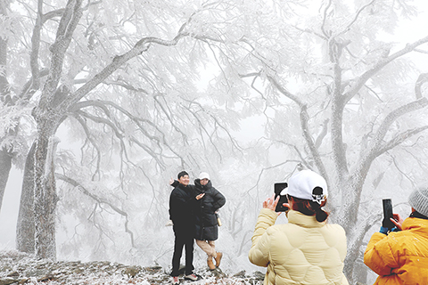 ◎ 一月二日,廣西三江侗族自治縣白雲山迎來二零二六年首場霧凇景觀。圖為遊客在拍照留影。(中新社發 龔普康 攝)