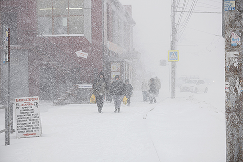 ◎ 1月10日,俄羅斯遠東城市符拉迪沃斯托克遭遇強降雪。圖為當日,在俄羅斯符拉迪沃斯托克,行人走在雪中。(新華社發 安德烈·馬特維延科攝)