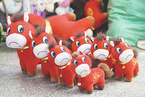 ◎ 一月十一日,多尺寸「哭哭馬」排排站。一位網友近日購入產自浙江義烏的馬年毛絨玩具,發現一隻次品──其嘴部被縫反,看上去十分委屈。「笑笑馬」變成了「哭哭馬」,相關話題沖上中國多個社交平台熱搜榜,採購訂單飛增,商戶開了十多條生產線正加緊趕貨。(中新社記者 董易鑫 攝)
