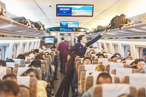 ◎ 一月十二日,G3602次列車長吳佳航整理行李架。近期,隨著高校陸續放假,大學生們踏上返鄉之路。新任職的高鐵女列車長吳佳航,負責值乘由瀋陽南站至北京朝陽站的G3602次列車,她憑藉十年高鐵乘務積累的豐富經驗,用細緻入微的舉措為大學生們保駕護航。(中新社記者 于海洋 攝)