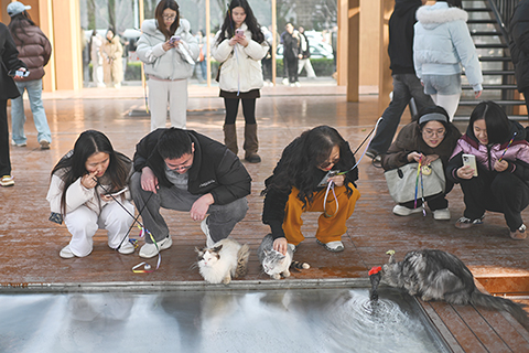 ◎ 一月十三日,遊客在重慶螢火蟲港灣貓貓主題樂園與貓咪玩耍。近日,該主題樂園營業,迅速成為當地熱門「打卡」地。數百隻曾被救助的流浪貓在此集體「上崗」,「打工」賺貓條。據悉,該主題樂園佔地約三萬平方米,以流浪貓救助為核心,收容曾遭遺棄或受傷的貓咪,經過專業治療與疫苗接種後,向遊客開放互動。樂園還兼具公益領養與文旅屬性,打造開放型領養平台,通過合規運營實現「以園養貓」,吸引眾多市民、遊客前來參觀、互動與「打卡」。(中新社記者 何蓬磊 攝)