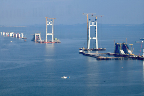 俯瞰建設中的廈金大橋 2026-01-18 03:30:00 ◎ 十月十六日,空中俯瞰建設中的廈金大橋(廈門段)。廈金大橋(廈門段)起於福建廈門環島東路與會展北路交叉口,終點設互通接入廈門翔安國際機場,並預留至金門段接口,路線全長約十九點六公里,其中主線長約十七點三四公里,翔安支線長約二點二七公里。(中新社記者王東明 攝)