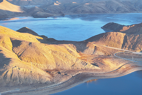 ◎ 一月十八日,西藏羊卓雍錯流域沉錯風光。沉錯地處西藏羊卓雍錯東部,是羊卓雍錯水系重要組成部份,湖形狹長、湖水深邃,因湖底地形複雜得名。作為羊卓雍錯流域內關鍵生態區域,沉錯已成為眾多候鳥越冬的樂園。(無人機照片)(中新社記者 貢嘎來松 攝)