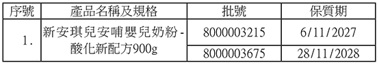 又,台灣地區食品藥物主管機構昨(22日)公佈,由於兩個批次嬰兒奶粉產品的原料可能受到微生物仙人掌桿菌(亦稱「蠟樣芽孢桿菌」)污染,正進行產品的回收。經查核,本澳沒有進口受影響品牌的嬰兒奶粉,產品具體資料如下: