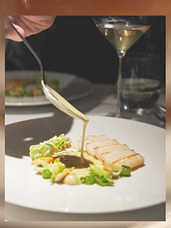 不得不贊嘆主廚的「煎功」,扇貝的火候堪稱完美。貝殼粉內藏豐富餡料,這一做法成功保證了其溫度與濕潤度,即便在冷空氣中也不易變乾變硬。