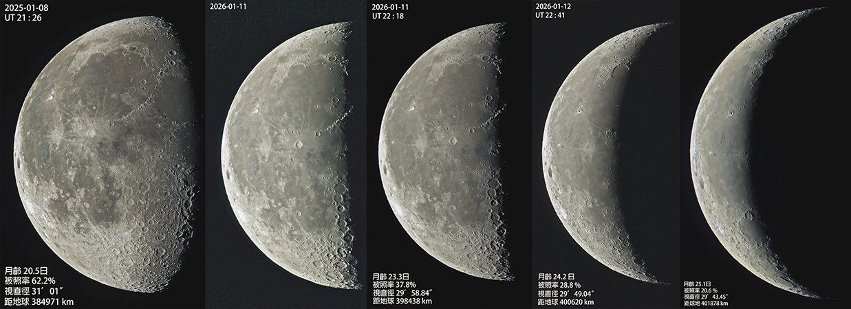 仙女座KX的雙極噴流 鉛筆星雲(NGC 2736) 木星和衛星 木星與雙子座流星雨 獵戶座與風暴之洋 兩天的太陽黑子變化 月相四貌 一月天象 所有對接端口全數停滿 國際太空站首次實現 下弦月後之月相 2026-01-26 03:30:00 難得一踏入二零二六年的天色持續晴朗,才可以拍到下弦月後的連續月相變化過程。然而由於月相是出現在日出前,所以,要大清早的日出前拍攝,由於這段日子剛好是寒流襲澳,要頂著寒風拍攝,這些影像得來不易呢。 Takahashi FC-N 100 F/9 With Hyper Sharp 1.8x Barlow;Camera Alfred Lee◇