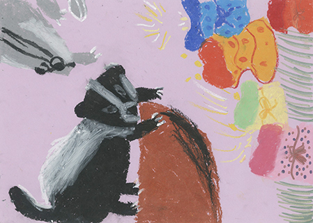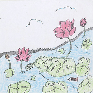 風「沙沙」地吹過葉子,幾滴露水掉了下來,落到了我的鼻尖上,清涼的感覺令人神清氣爽。忽然,小徑上悄悄下起了毛毛雨,我趕快跑到小亭子裏。周圍的景色彷彿蓋上了一層灰濛濛的布,四處的顏色暗淡了許多。青蛙像一位身披綠色袍子的小精靈,在一片灰色中格外顯眼。