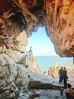 島南端的神石園飛戟洞,乃海蝕地質公園。一縷天光自巖隙刺入,照亮千年海蝕形成的奇岩異孔,令人感嘆自然鬼斧神工與時光滄桑。
