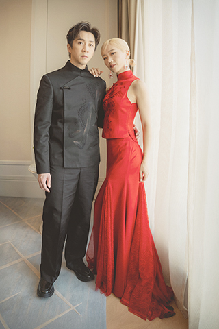 新娘Lulu身著一襲夏姿紅中式立領削肩背心,搭配蕾絲絲緞拼接魚尾拖曳長裙,以兩件式設計勾勒嬌小身形比例。削肩線條與中式立領相互呼應,展現俐落與柔美並存的女性風貌。經典的夏姿紅也在Lulu身上顯得格外清雅動人,為年輕世代演繹當代視角下的東方優雅。禮服以「鳳」為題,寓意著柔韌與祥瑞,與新郎禮服上的「龍」意象相互呼應,寄託對新人圓滿、和合的祝福。