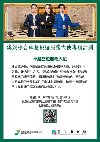 【特訊】為應對澳門旅遊業發展需要,以及節假日期間有大量的旅客接待工作,勞工事務局(下稱「勞工局」)和澳娛綜合度假股份有限公司(下稱「澳娛綜合」)合作推出「澳娛綜合卓越旅遊服務大使專項計劃」(下稱「計劃」),以「先入職、後培訓方式」,培養一批具跨部門工作技能的前線旅遊服務人員。今(28日)起接受申請。