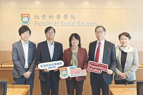 ◎ 一月廿八日,香港大學人口研究中心公佈香港綜合社會調查的研究結果,數據顯示與二0二一年進行的同類調查相比,近期港人移民的意向低於二0二一年的結果。圖為團結香港基金副總裁兼公共政策研究院執行總監水志偉(左一)、郭一葦慈善基金代表郭家聲(左二)、香港大學社會科學學院院長文鳴(左三)、香港大學人口研究中心總監方偉晶(左四)及香港大學秀圃老年研究中心總監及香港大學人口研究中心副總監樓瑋群(左五)。(香港中通社記者 梁嘉軒 攝)