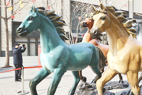北京街頭駿馬雕塑引遊人 2026-01-30 03:30:00 ◎ 一月二十九日,在北京王府井大街上,中國工藝美術大師朱炳仁的作品《王府八駿》吸引遊人駐足觀賞。馬年將至,北京一些與馬相關的藝術裝置紛紛亮相,盡顯年味。(中新社記者 易海菲 攝)
