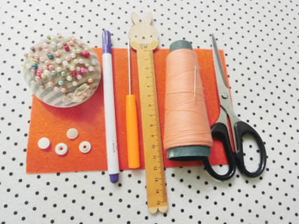 (2)橙色線卷一個,手針一支,剪刀一把,珠針一盒,水消筆一枝,直尺一把,1cm白色圓形平面扣一組,尖錐支枝。