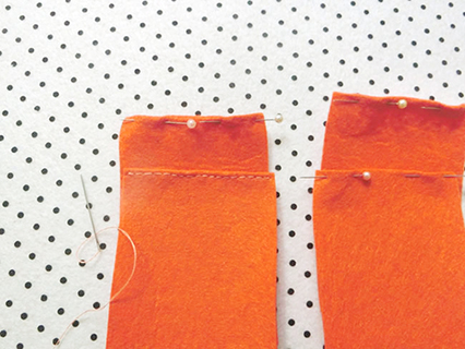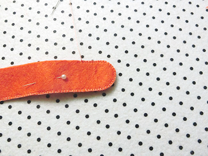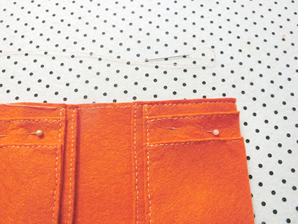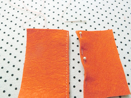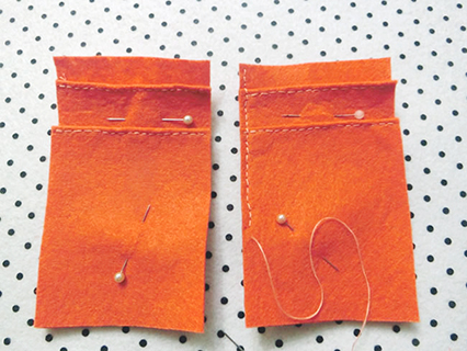 (六)用珠針將兩塊布帶布重疊並固定好,再以鎖針的方法縫製。