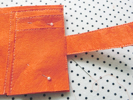 (七)用珠針將銀包內外面布與縫好的貼布、A、B、C、D內貼布重疊並固定好,並在適合的位置套入布帶布,再以鎖針的方法縫製。