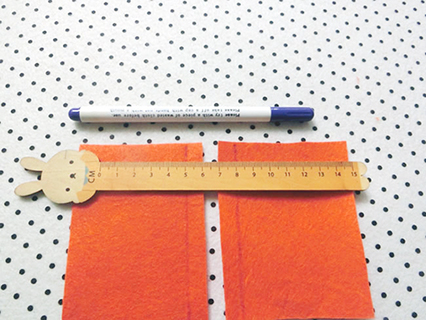 (二)在兩塊A內貼布的布面長則的布邊位置用筆和直尺畫上6cm直線作記號,及將布邊向內摺起並珠針固定好,再以平針的方法縫製。