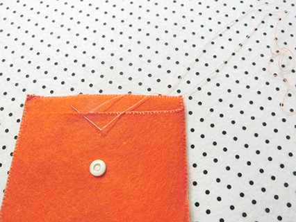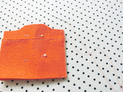 (九)將畫上了記號的証件套內貼布的布邊向內摺起並用珠針固定好,再以平針的方法製作。