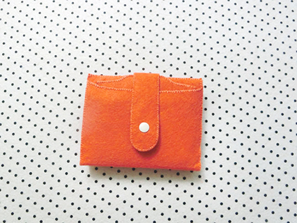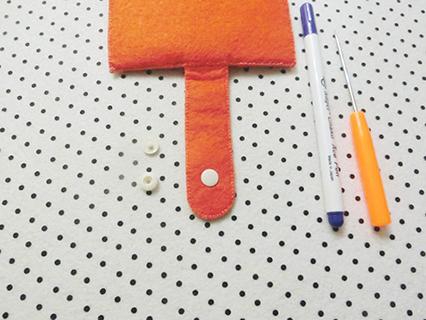 (十二)在銀包外面布的布面適合位置上畫上記號,然後用尖錐錐穿一小孔(注意不要錐穿銀包內面布),接著在外面布內的小孔位置上先扣上平面扣,及套上按鈕扣再用力向下按壓好。