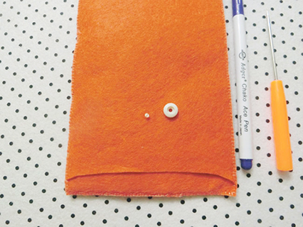 (十一)在布帶布的布面適合位置上畫上記號,然後用尖錐錐穿一小孔,接著在布面底部的小孔位置先扣上按鈕扣,及套上平面扣再用力向下按壓好。
