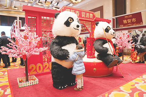 ◎ 二月一日,「迎新春促消費」四川冬季旅遊精品線路暨年貨北京推介周活動在北京天府蜀風酒店啟動。本次活動推出康養、冰雪、民俗等主題的四川冬季旅遊精品線路,同時設置四川二十一個市(州)的一千餘種川味年貨展銷平台,為首都春節消費提供多樣選擇。圖為小朋友與熊貓人偶互動。(中新社記者 張祥毅 攝)