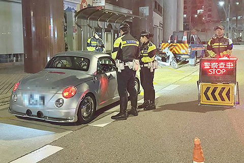 查車行動方面,共截查卅一輛車輛,合共檢控五宗違例(一宗沒有佩戴安全帶、一宗未能出示有效駕駛執照、一宗加裝顏色燈、一宗沒有使用行車燈及一宗輪胎尺寸與登記摺所載不符)。