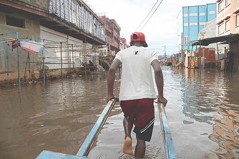 ◎ 馬達加斯加國家風險和災害管理辦公室二月二日發佈統計數據說,熱帶氣旋「菲蒂亞」過境該國已致七人死亡,超過五點四萬人受災。圖為當日,在馬達加斯加首都塔那那利佛,當地居民拉手推車通過積水路面。(新華社發 西塔卡.拉喬納里松 攝)