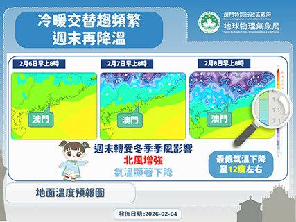 又預料本周末(7至8日)轉受冬季季風影響,北風增強,氣溫顯著下降,周日(8日)最低氣溫下降至12度左右,天氣漸轉晴朗乾燥,但風力較大使得溫度體感寒冷,周末外出時應帶備厚衣,防範早晚氣溫起伏。