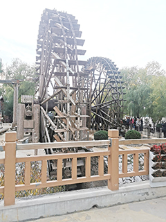 午餐後的景點,是遊覽蘭州水車園,這是百里黃河風景線上最具蘭州地方特色的景點之一。它是由蘭州市旅遊局於1994年為再現這一古老的灌溉工具,專門設計仿建的遊覽參觀公園,佔地有14500平方米。公園由雙輪水車、圍堰、水磨坊服務室和遊樂區等組成,足以讓中外遊人大開眼界。水車輪輻直徑達16.5米高,幅條盡頭裝有刮板,刮板間裝有等距斜掛的長方形水斗,水車立於黃河南岸,旺水季的時候,利用自然水流幫忙水車轉動;到了枯水季的時候,則以圍堰分流聚水,通過堰間小渠,河水自流助推。這種通過水車轉動,自動提水灌溉農田的水利設施,就是古代的「自來水工程」了。