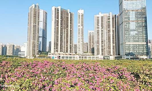 灣區之眼的大部分空間處於地面之下,地上僅五層,建築高度也只有十二米。樓頂有二萬平方米的空中花園。在樓頂的邊沿,多是栽種成叢成簇之花,如三角梅等。其餘部分,則是草坪。據深圳出版集團的負責人介紹,此空中花園,多被用來開發佈會、酒會、篝火晚會等。尤其是在夏天的時候,涼風習習,星空璀璨,周邊高樓燈火通明,置身此空曠之半空,心曠神怡,爽快愜意,無比的舒暢。