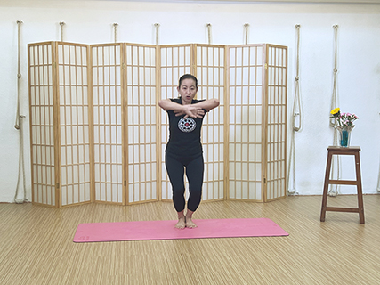 之後再一次屈曲手肘,十指相對,掌心朝地,雙手放置於胸前,張開雙手,兩臂延展。期間保持呼吸穩定暢順,停留約半分鐘。