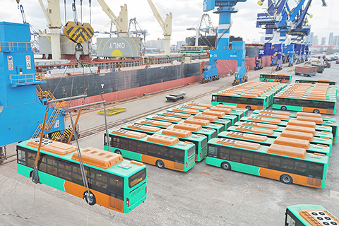 ◎ 二月六日,出口墨西哥的天然氣公交車在山東港口煙台港裝船(無人機照片)。 二月七日,一百輛出口墨西哥的天然氣公交車在山東港口煙台港完成裝船並啟程。這批天然氣公交車是安凱客車基於墨西哥市場需求研發的定製化產品,擁有更低氣耗、更強動力和更長續航,將投入到墨西哥蒙特雷市的公共交通系統。(新華社發 唐克 攝)