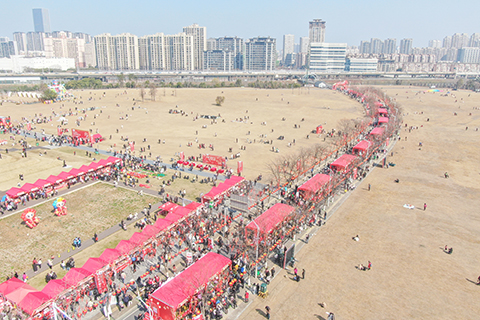 ◎ 二月八日,江西南昌,2026南昌迎春花市在九洲公園正式開市,吸引市民前來選購花卉。本次迎春花市既有蝴蝶蘭、大花蕙蘭等年宵花,也有年桔、杜鵑、富貴竹等寓意吉祥的綠植。圖為航拍2026南昌迎春花市。(無人機照片)(中新社記者 劉力鑫 攝)