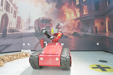 ◎ 二月十日,湖南首家機器人9S店在長沙對外開放。門店集場景展示、產品銷售、租賃服務等九大功能於一體,匯聚智慧康養、智能製造等六大領域百餘款機器人產品,呈現五十多個典型應用場景。圖為店內展示的消防機器人。(中新社記者楊華峰 攝)