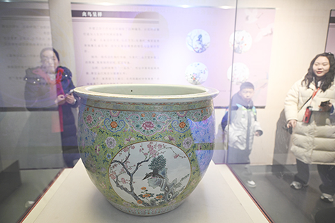 ◎ 二月十日,瀋陽故宮敬典閣「院藏珍寶展」換展,「清綠地粉彩開光花鳥紋魚缸」亮相,以「金玉」開年,借瑞鳥呈祥,為農曆春節送上新歲祝福。圖為參觀者觀看清綠地粉彩開光花鳥紋魚缸。(中新社記者于海洋 攝)