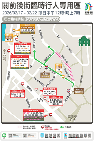 巴士服務方面,為配合行人專用區及節假日臨時分流安排,氹仔舊城區及關前後街周邊的巴士站點及路線實施以下臨時調整: