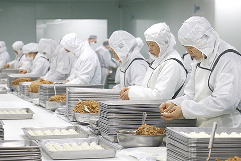 ◎ 二月十一日,在浙江紹興嵊州一家小籠包工廠,工人們手工製作小籠包。春節將至,該工廠百餘名工人開足馬力,加緊趕製嵊州小籠包訂單,為春節市場備足年貨。(中新社記者 項菁 攝)
