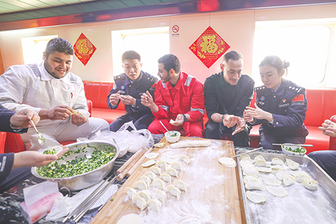 山東榮成:外籍客滾船上年味濃 2026-02-14 03:30:00 ◎ 2月13日,在山東省榮成市石島口岸龍眼港,停靠於此的外籍客滾船「阿爾傑裡烏」輪上年味濃濃。石島邊檢站民警與外籍船員一同包餃子、掛福字,感受中國傳統年俗。(中新社發 李信君 攝)
