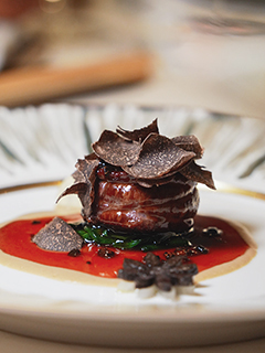 主菜以來自澳洲的牛里脊上陣,肉質緊緻細膩,脂肪比例較為含蓄,與肥潤甘腴的鵝肝恰好相襯。主廚再度現身,主持松露加持儀式,沒想到三款個性如此霸道的食材,竟能共存得如此融洽。