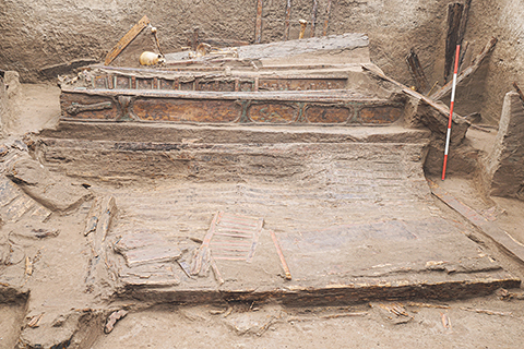 ◎ 這是在實驗室考古方艙內拍攝的墓葬M20出土的木棺座壼門內的彩繪「瑞獸」圖案(二月一日攝)。(新華社記者李賀 攝)