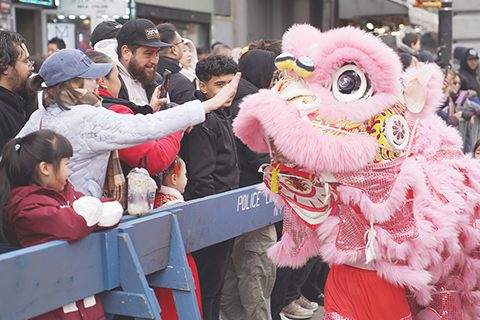 ◎ 二月廿一日,觀眾在美國紐約觀看舞獅表演。當日,美國紐約法拉盛舉行遊行活動,慶祝中國農曆馬年春節。(新華社記者 張鳳國 攝)