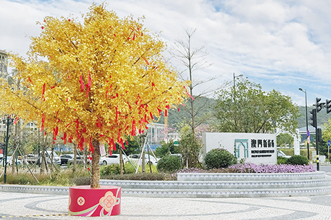 澳門新街坊呈獻多款「好意頭」的互動打卡裝置,向居民們送上節日祝福。當中必到打卡點是巨型「黃金發財樹」,樹身滿佈黃金樹葉,寓意招財進寶、豐足美滿,市民可將寄托心願的紅絲帶拋擲到樹上許願,打卡互動更可享揮春或利是封套裝一份。