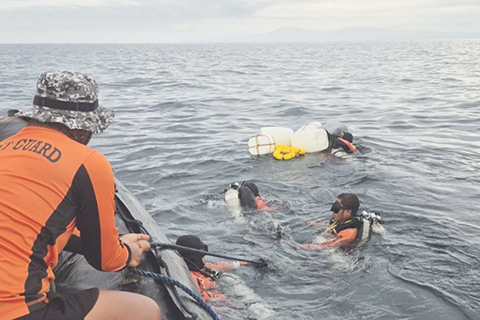 ◎ 菲律賓海岸警衛隊二月二十四日通報說,已完成對該國南部海域沉沒渡輪的水下搜尋工作。目前,這起事故已確認六十五人死亡、二百九十三人獲救,仍有十四人失蹤。一月二十六日凌晨,一艘渡輪在菲律賓南部巴西蘭省附近海域沉沒,事發時該渡輪上共有三百七十二人。圖為二十二日,在菲律賓巴西蘭島附近海域,菲律賓海警技術潛水員進行水下作業。(新華社發菲律賓海警供圖)