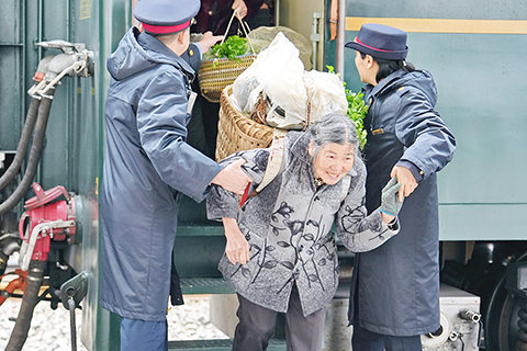 ◎ 二月廿五日,在遵義市,五六三0次列車到達桐梓站後,鐵路工作人員協助村民下車。穿行在崇山峻嶺間的五六二九/五六三0次列車,是一趟連接貴州遵義與重慶的公益「慢火車」,開行三十三年來,它以低廉的票價和「站站停」的堅守,不僅方便了沿線群眾的日常出行與農貨運輸,還在車廂裡設置了惠農專區,方便菜農安置貨物及售賣。這趟穿行於渝黔山區的列車成為沿途老鄉們的「流動集市」,也串起了一條山區群眾的出行路與致富路。(新華社發 張維 攝)
