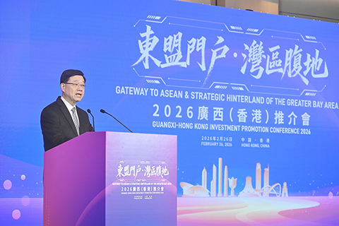 「中國人民抗戰勝利80周年紀念章」 移交儀式在香港舉行 李家超推介會上致辭 科網股下跌拖累 港股挫三八四點 香港放寬訪港旅客使用e-道 兩年經港機場入境兩次者可使用 港區人大代表為大灣區的進一步聯通 建言獻策將提逾卅項建議 國家級創新中心將在香港設立 孫東:聚焦半導體研發 黎智英欺詐科技園案上訴得直 律政司擬就判決提出上訴 李家超出席八和會館馬年新春團拜指出 粵劇是香港引以為榮的文化瑰寶 處理國安通緝犯資金罪成 郭鳳儀父被判囚八個月 大埔火災災民義診服務 延至今年八月底 李家超推介會上致辭 2026-02-27 03:30:00 ◎ 二月廿六日,香港特區行政長官李家超在「東盟門戶‧灣區腹地─二0二六廣西(香港)推介會」致辭。(香港中通社圖片)