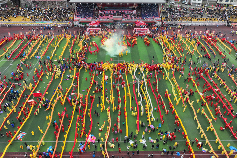 ◎ 二月廿七日,航拍「仡佬毛龍節」現場。當日,貴州省銅仁市石阡縣「仡佬毛龍節」在該縣體育場舉行,當地各村寨及參加展演的八十條「仡佬毛龍」齊舞賀新春。「仡佬毛龍」是石阡仡佬族世代流傳下來的新春主要慶祝活動之一,期間,石阡各村寨村民就會自發組織編扎毛龍,鬧新春,送吉祥。(無人機照片)(中新社記者瞿宏倫 攝)