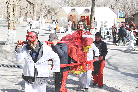 ◎ 3月1日,寧夏銀川,遊客在滾鍾口景區與NPC互動。今年春節以來,銀川文旅集團滾鍾口景區打造了「大王叫我來巡山」沉浸式體驗活動,將《西遊記》情節與景區實景深度融合,使整個景區變身為沉浸式互動劇場,讓遊客在「巡山」「闖關」的過程中,感受可觀、可玩、可參與的西遊奇遇。(中新社記者 于晶 攝)