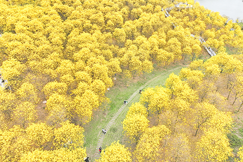 廣西南寧金色花海引遊人 2026-03-04 03:30:00 ◎ 三月三日,廣西南寧青秀山黃花風鈴園的黃花風鈴木競相綻放,如同金色浪潮,吸引遊人專程前來踏春賞花。(無人機照片) (中新社發 陳冠言 攝)