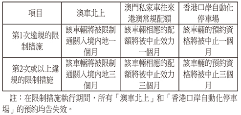 【特訊】隨着「澳車北上」通關車輛數量持續上升,以及港珠澳大橋各項跨境新政策相繼出台,交通事務局與各相關監管部門溝通和協調,為進一步加強監管及構建更為公平的使用制度,於三月四日以特區公報方式刊登有關「澳車北上」的預約規則,並同時修訂「澳門私家車往來港澳常規配額」公告的應遵事項。按照規定,自三月十五日起,如發現車輛未有遵循「澳車北上」預約規則進入內地,將對其實施限制措施,同時將中止倘有的「澳門私家車往來港澳常規配額」的效力及/或「香港口岸自動化停車場」預約資格(詳見下表)。有關預約通關規則及限制措施詳情,可瀏覽「澳車北上」專頁(https://www.dsat.gov.mo/mcars-to-gd/index.aspx)相關內容。