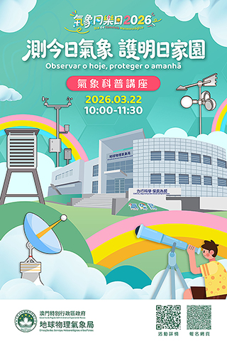 【特訊】為慶祝三月廿三日「世界氣象日」及加深公眾對氣象科普知識的了解,地球物理氣象局將舉辦面向全澳居民的「氣象同樂日」活動,以及面向年滿十歲或以上之本澳居民的「測今日氣象,護明日家園」氣象科普講座及參觀活動。兩項活動皆由即日(三月四日)起至三月九日透過一戶通的「活動報名」欄目報名,參加者於活動結束後可領取精美紀念品乙份。歡迎市民踴躍參加,一同體驗氣象科學的樂趣。